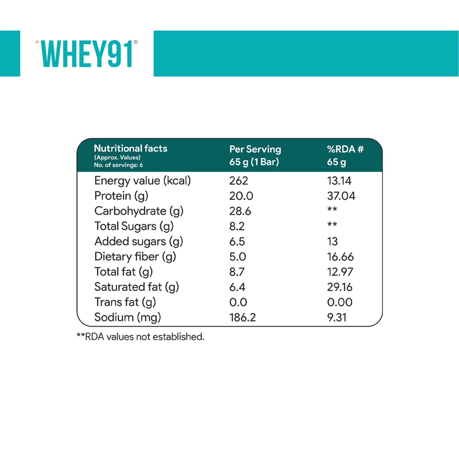 Each 65g bar of Whey91 contains premium protein content of 20g.